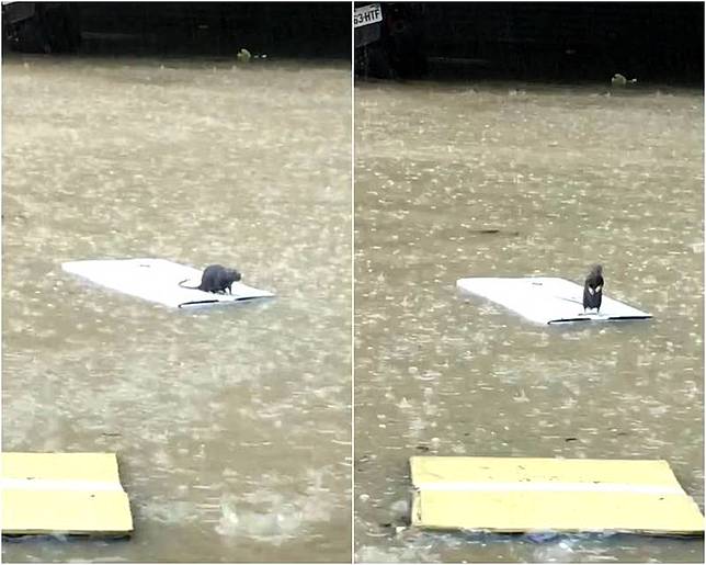 © 由 鏡週刊 提供 信義區吳興街商圈淹成一條小河,一隻老鼠因為淹水被困在白色板子上四處漂流。(翻攝爆廢公社) (翻攝爆廢公社) 短短23秒.